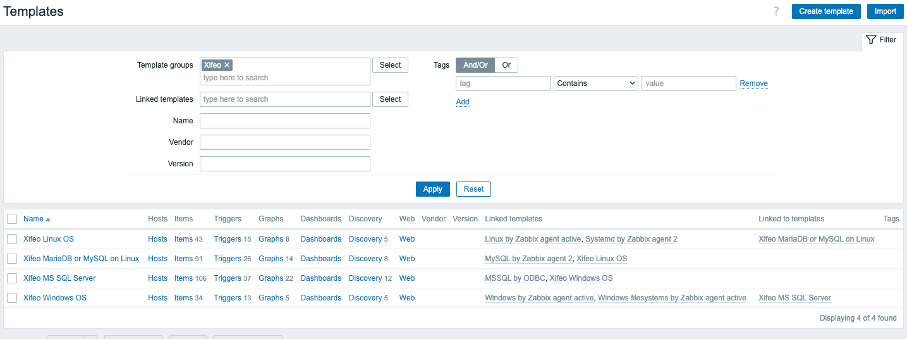 The overarching templates, such as Xifeo MS SQL Server, which encompass multiple templates, are useful for defining threshold values specific to this organization (or even groups of hosts within this organization). Organization-specific (dependent) items must also be placed in the overarching templates.